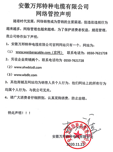 鄭重聲明:安徽萬邦特種電纜有限公司官方網站為:www_wanbangcable_com.tongdafood.com,除此之外無任何子網站或合作網站,其余均為假冒偽劣。電話:0550-7621728 13485756353 地 址:安徽省天長市滁州高新技術產業開發區經四路29號